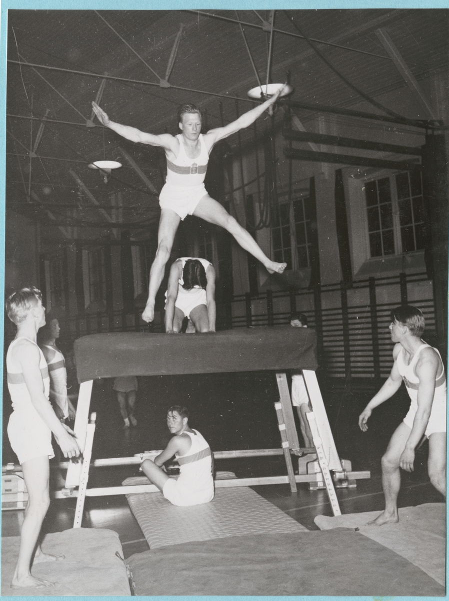 En ung, gymnastikklädd man hoppar bock över en kamrat som sitter på en plint. De befinner sig i en gymnastiksal med kamrater runtomkring. Golvet är täckt med madrasser framför för att ta emot fallet.