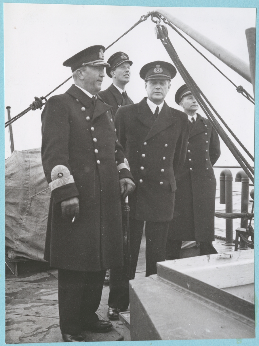 Konteramiral Ehrensvärd står uniformsklädd ombord på ett fartygs ytterdäck tillsammans med ytterligare tre högre militärer. I ena handen håller han en cigarett och i den andra en käpp.