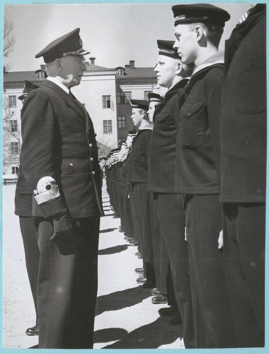 Viceamiral Strömbäck står framför en rad med uppställda flottister på bataljon Sparres kaserngård. Samtliga är klädda i uniform. I bakgrunden syns kasern Sparre.
