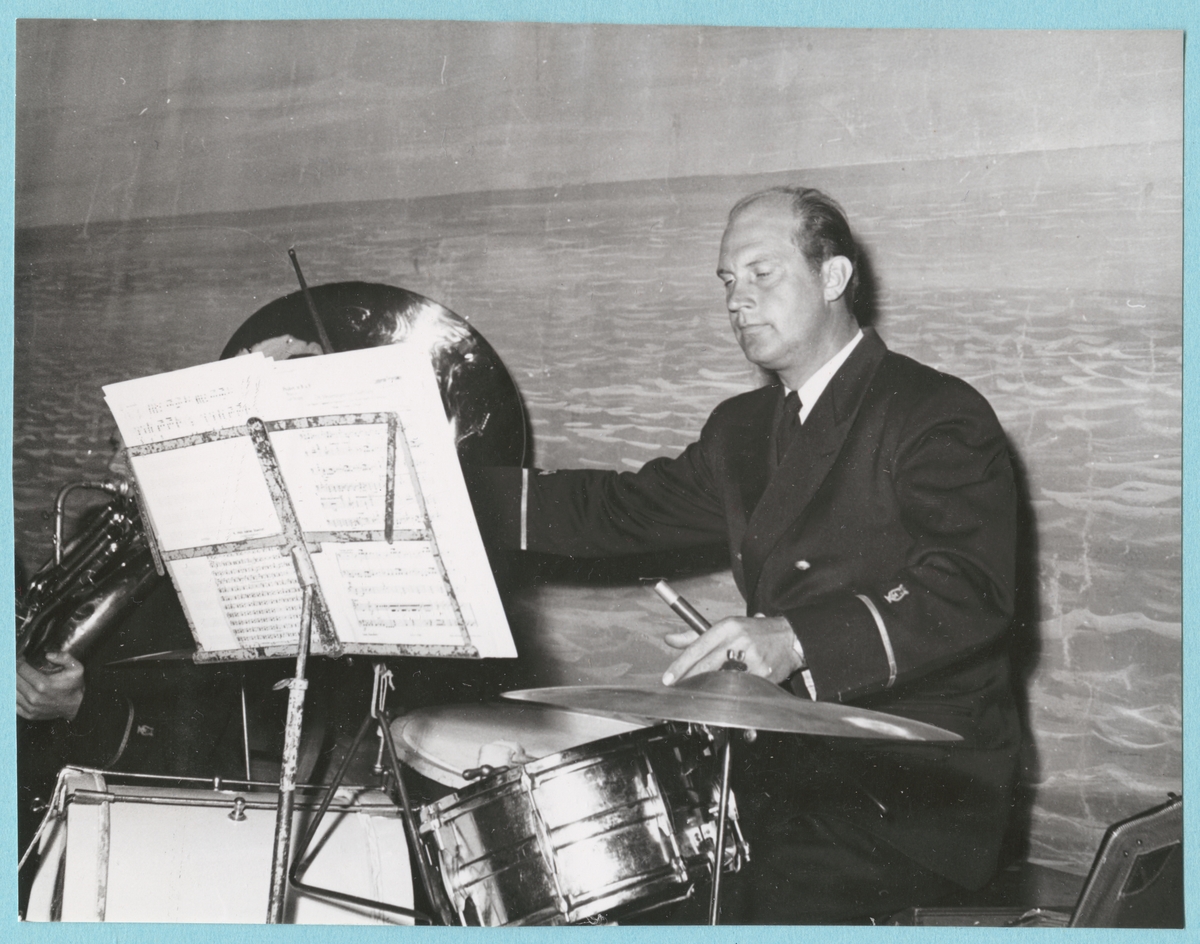 Slagverkare Stig Hallberg bläddrar bland notpapprena framför sig. Runtomkring honom står ett trumset. Flottans Musikkår, K-a.