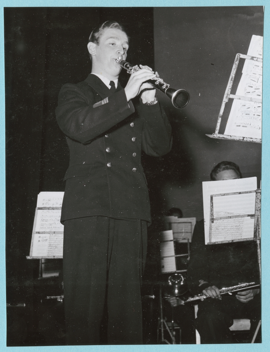 En klarinettist spelar på en klarinett som en del av Flottans Musikkår. Runtomkring honom syns fler musiker samt notställ med nothäften i. K-a