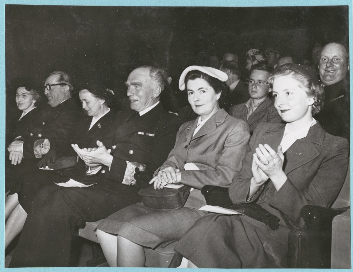 Viceamiral Strömbäck och konteramiral Samuelson, klädda i uniform, sitter i publiken till en musikföreställning med Flottans musikkår på konserthusteatern i Karlskrona. Bredvid dem sitter dräktklädda kvinnor.