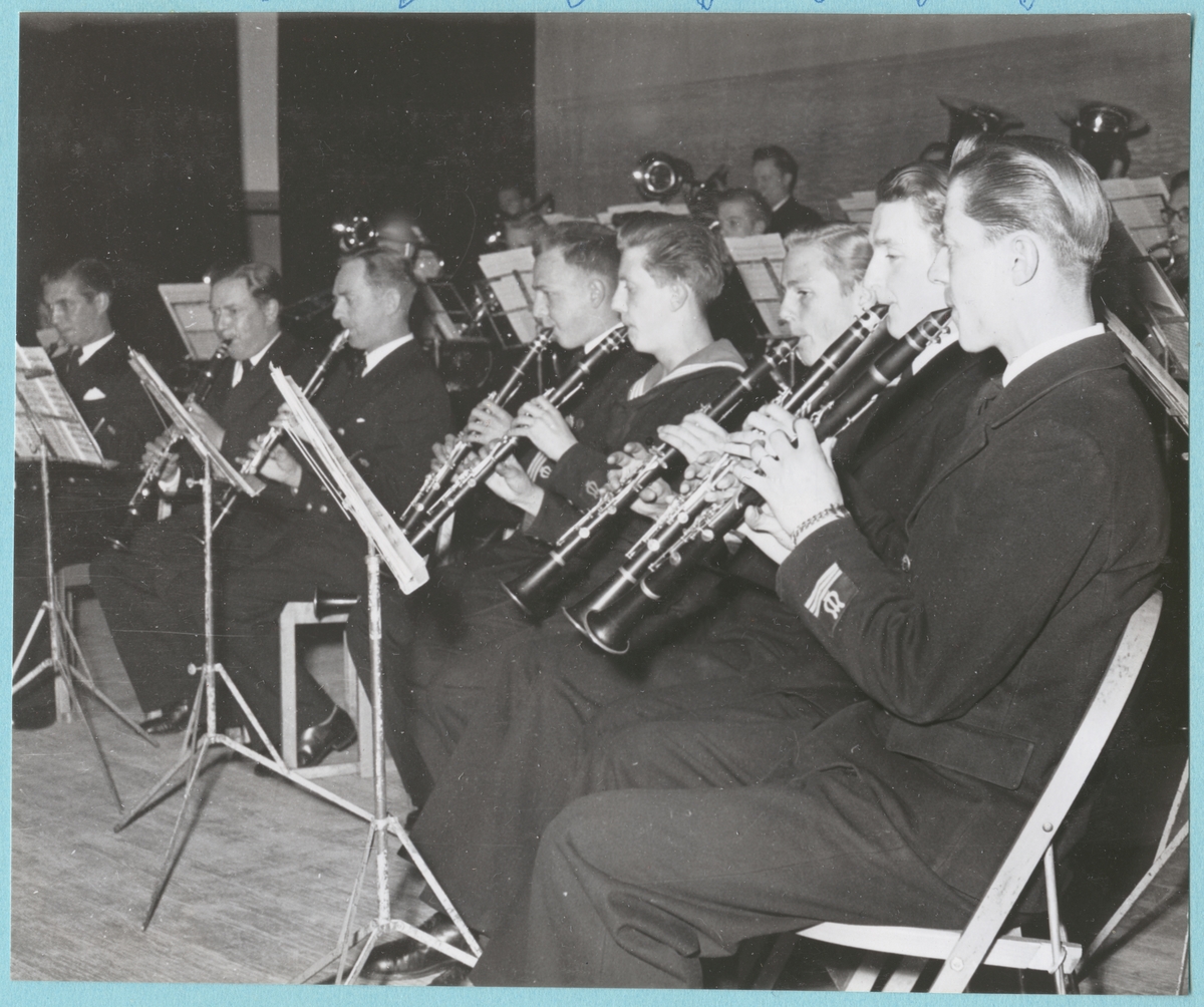 Klarinettister i Flottans Musikkår, K-a. Från vänster (enligt registreringskort): Tolf Sigurdson, Wedeborg, Forslund, Bjarnel?, ?, Olsson, ? och Stenholm.