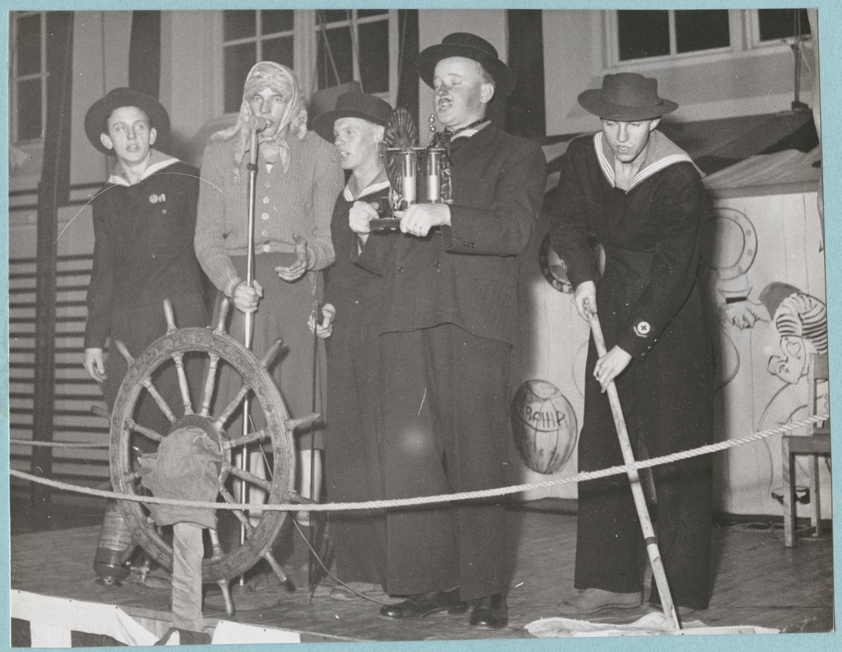 En grupp utklädda unga män, tre med flottistuniformer, en utklädd till gumma samt en i hatt och kostym står på en scen i en gymnastiksal och uppträder i en teater.