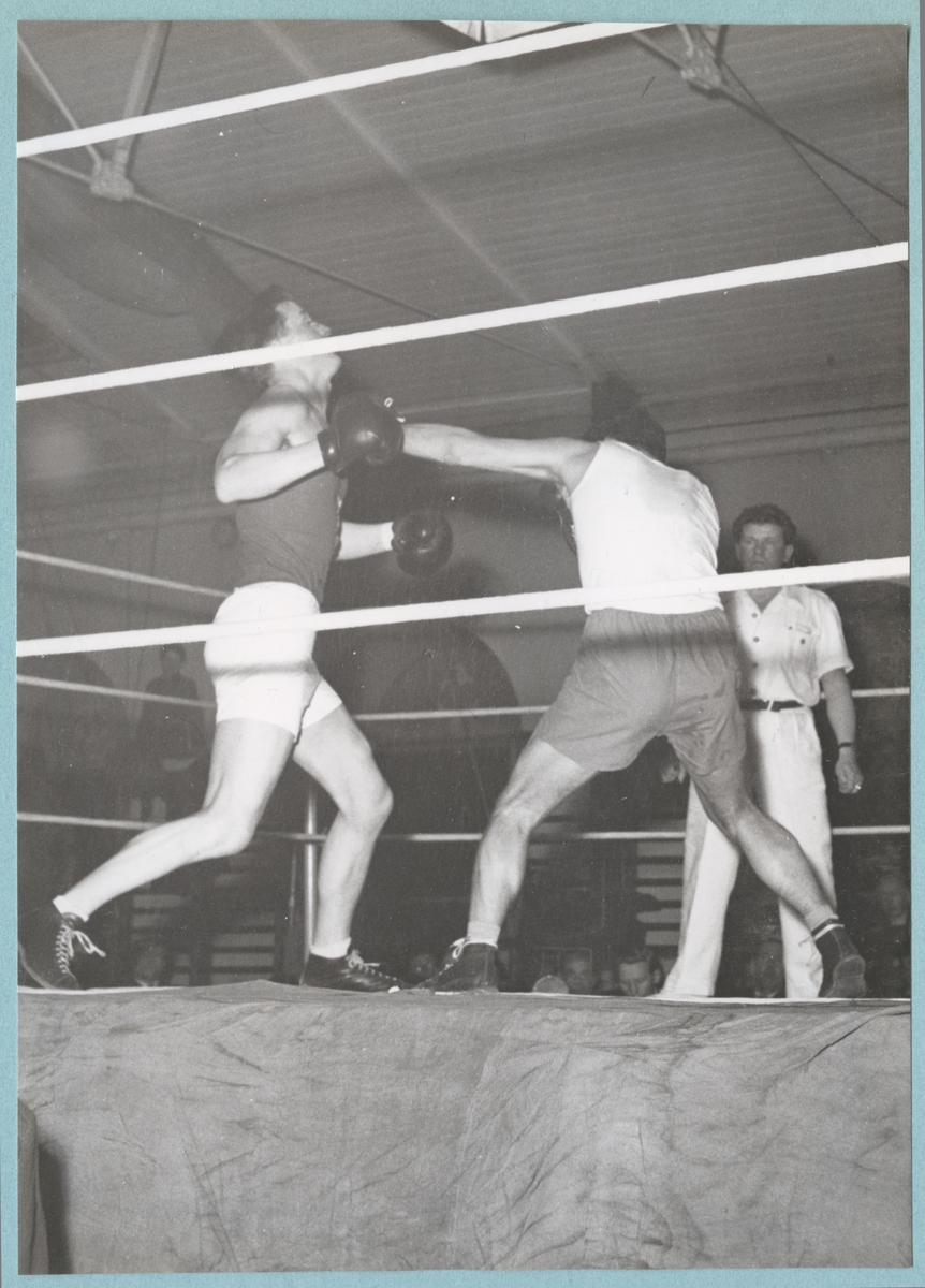 Två idrottsklädda män, utrustade med boxningshandskar, står i en boxningsring och boxas. Den ena mannen svingar ett slag mot den andre. Bakom dem står även en domare i ringen.
