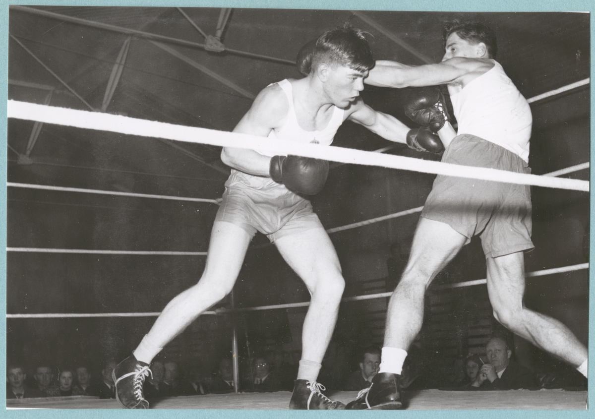 Två boxare står i en boxningsring och utkämpar en match. Männen är klädda i idrottskläder och utrustade med boxningshandskar. Nedanför boxningsringen syns en sittande publik.