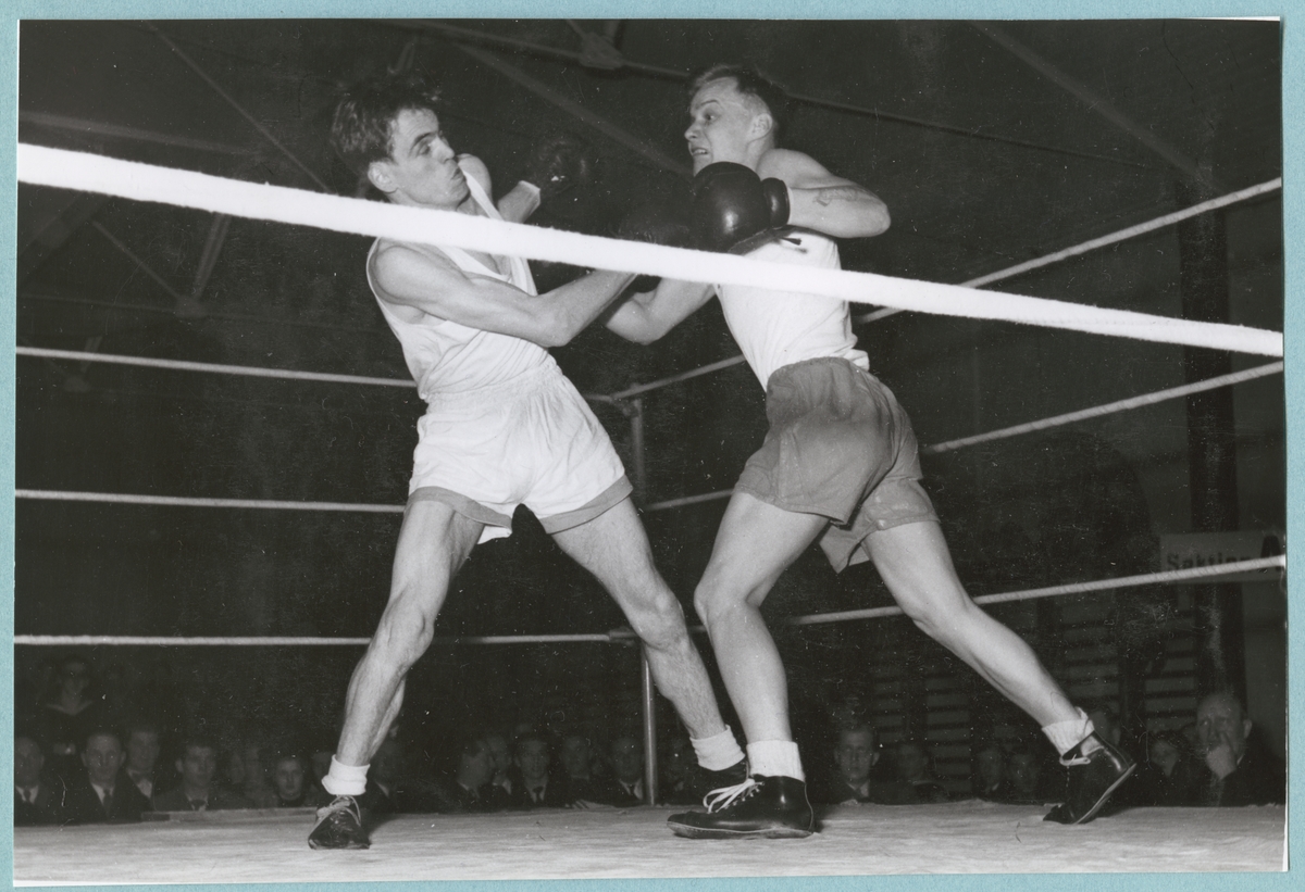 Två boxare kämpar i en boxningskamp. Utanför boxningsringen står åskådare och ser på. De är iförda träningskläder och boxningshandskar.