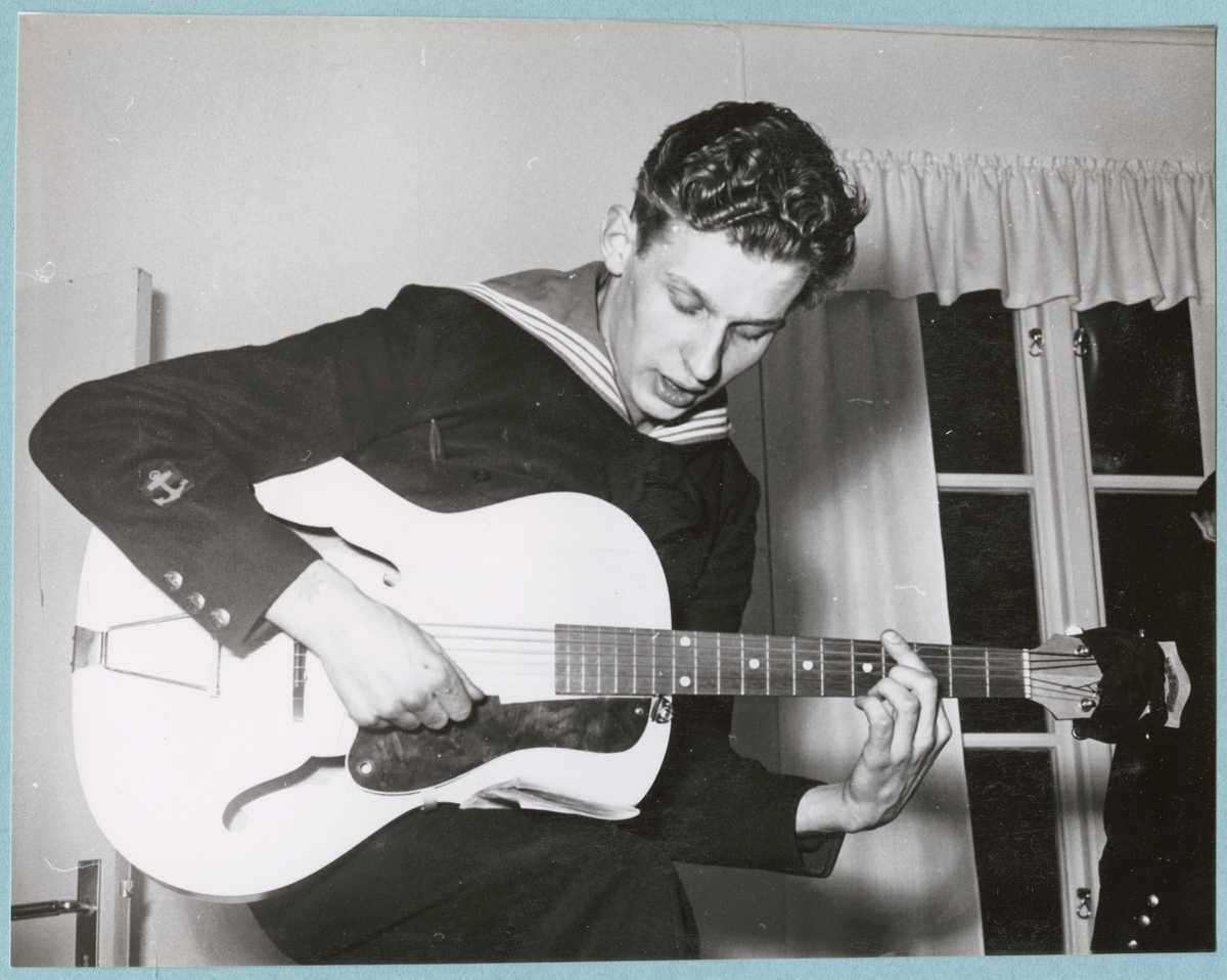 Titel: En uniformklädd flottist från pluton 21 spelar gitarr och sjunger. Bilden är daterad till 25-2-1952.