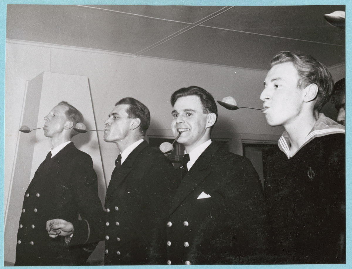 Fyra uniformsklädda militärer från pluton 21 deltar i en äggtävling. I munnen har de varsin sked med ett ägg på. Bilden är daterad till 25-2-1952.