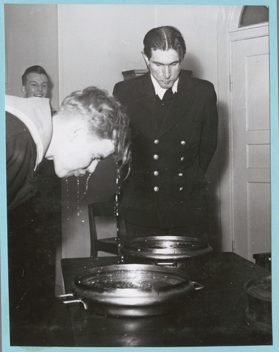 En flottist och en militär tävlar mot varandra i en lek där man ska fånga ett föremål med munnen i en skål med vatten. I bakgrunden syns en skrattande flottist. Fotot är kommenterat med "Plut 21 Skönstavik 25-2-52".