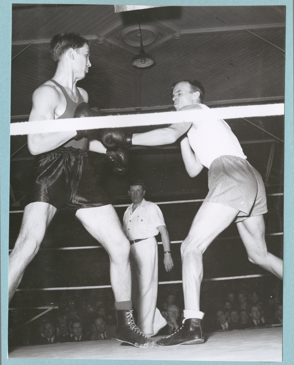Två boxare står i en boxningsring och utkämpar en match. Båda har idrottskläder och är utrustade med boxningshandskar. Bakom boxarna står även en domare i boxningsringen. Nedanför boxningsringen syns en sittande publik.