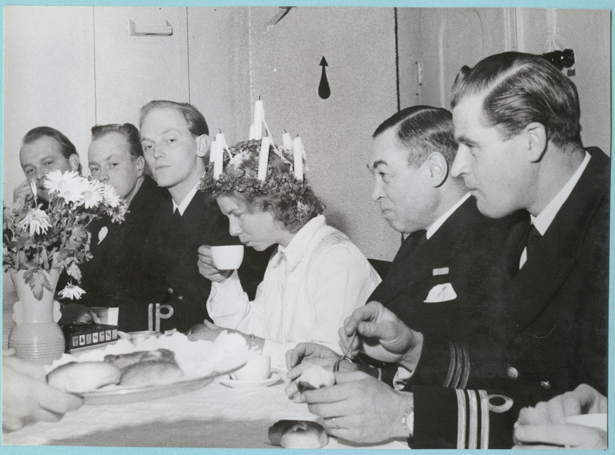 En Lucia sitter vid ett bord tillsammans med uniformsklädda militärer, bl. a. en löjtnant och en kapten. Lucian är klädd i vit skrud och bär på huvudet en ljuskrona. Tillsammans dricker de kaffe och äter lussebullar. På bordet står även en vas med blommor.
