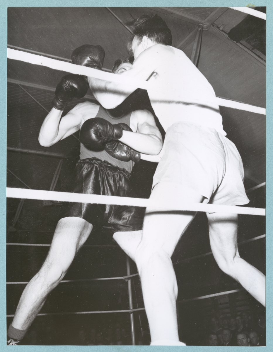 Två boxare står i en boxningsring och utkämpar en match. Båda är klädda i idrottskläder och är utrustade med boxningshandskar.