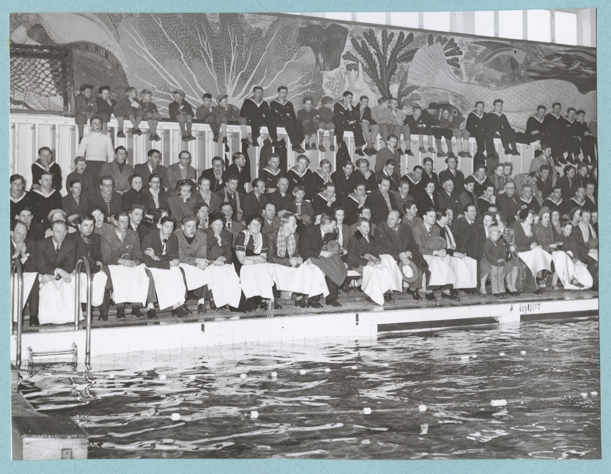 Flottister och civila åskådare sitter på läktaren i simhallen på Bataljon Sparre. Framför dem ligger simbassängen. Fotot är daterat till 15-3-52.
