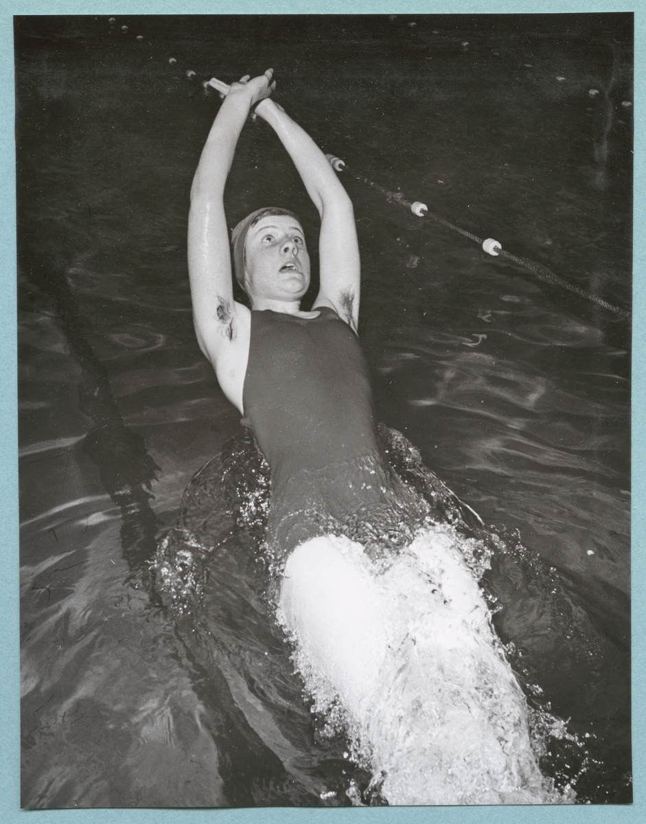 En kvinnlig simmare, i baddräkt och badmössa, simmar på rygg i bassängen tillhörande Sparres simhall. Fotot är daterat till 15-3-1952.