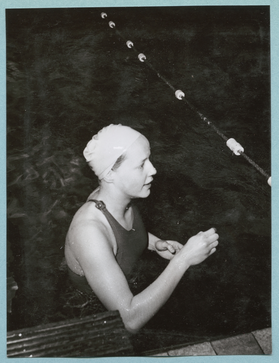 En kvinnlig simmare, klädd i baddräkt och badmössa, står i simbassängen tillhörande Sparres simhall. Fotot är daterat till 15-3-1952.