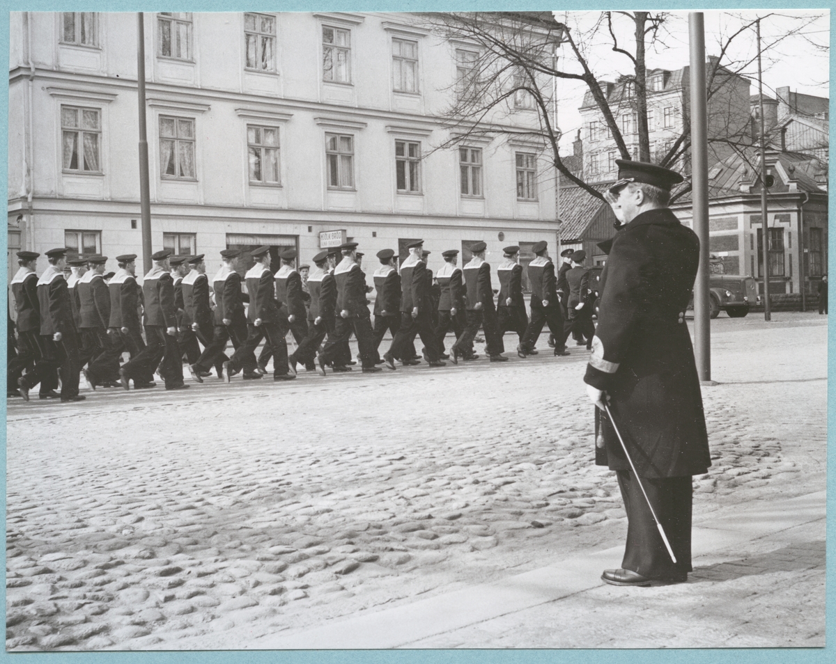 Konteramiral Samuelson står utanför Bataljon Sparre och gör honnör åt en förbiparaderande grupp med flottister på Drottninggatan. Fotot är daterat till 17-3-52.