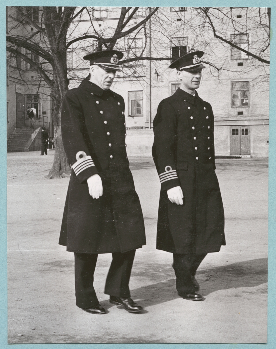 En kommendör går tillsammans med en kommendörkapten över kaserngården vid Bataljon Sparre. De är båda uniformsklädda. I bakgrunden syns en kasernbyggnads fasad och ett lövlöst träd.