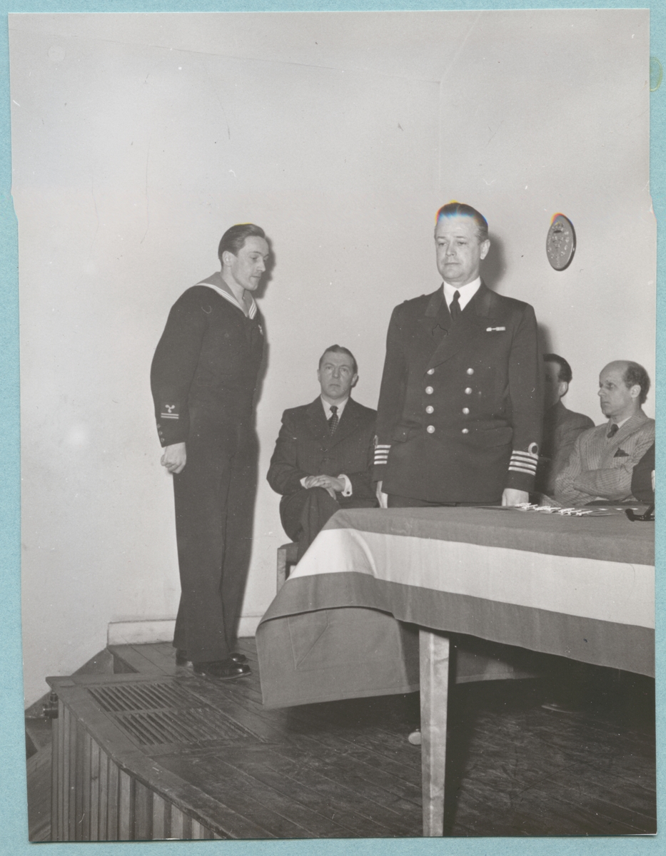 En kommendörkapten står på ett podium av trä tillsammans med fler militärer av varierande graderingar. På podiumet står också ett bord med en duk på.
