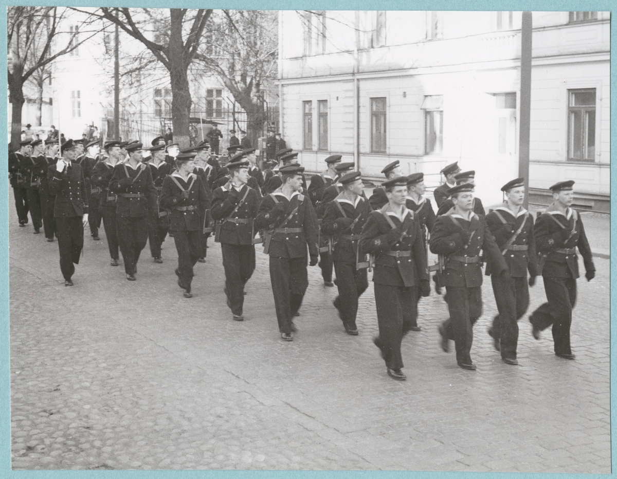 En grupp uniformsklädda flottister marscherar på Drottninggatan. Längs med gatan syns militärer som tittar på marschen. Vid sidan om truppen syns byggnader till Bataljon Sparre.