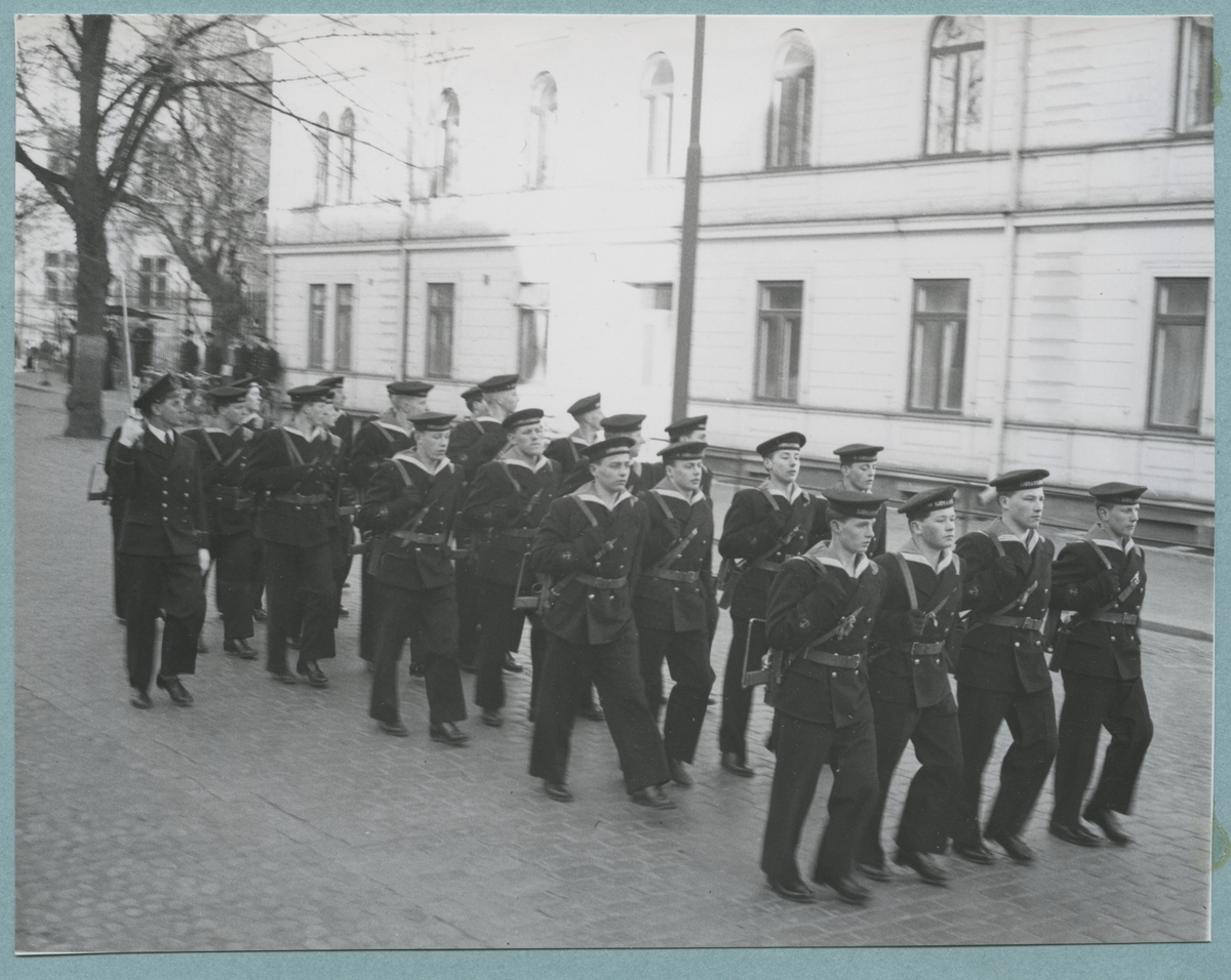 En grupp uniformsklädda flottister marscherar på Drottninggatan. Vid sidan av gruppen går en fänrik med en lans i luften. Längre bak på gatan syns en grupp människor stå och se på. I bakgrunden syns bataljon Sparre.
