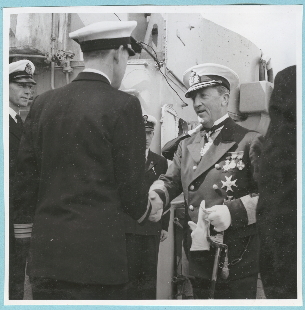 Konteramiral Samuelson tar i hand med en kapten ombord på ett örlogsfartyg. Han är klädd i en fin dräkt med medaljer på. Från Danska och Norska örlogsbesöken den 29/6 - 4/7 1951.