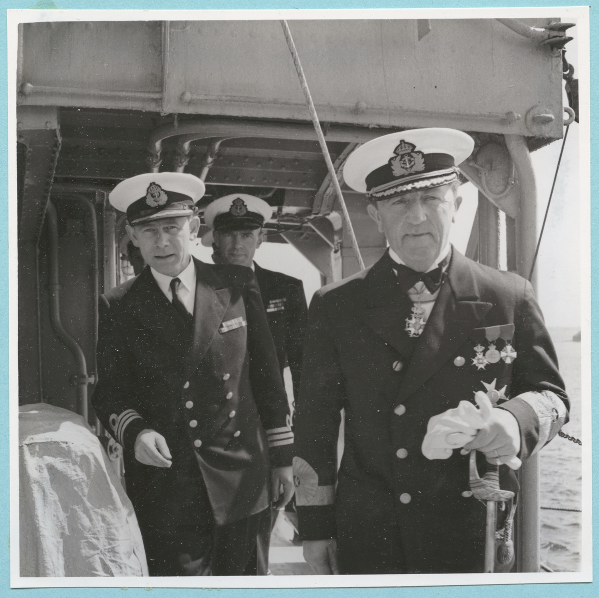 Konteramiral Samuelson tillsammans med en kapten och ytterligare en militär ombord på ett örlogsfartyg. Alla tre är klädda i uniform.
