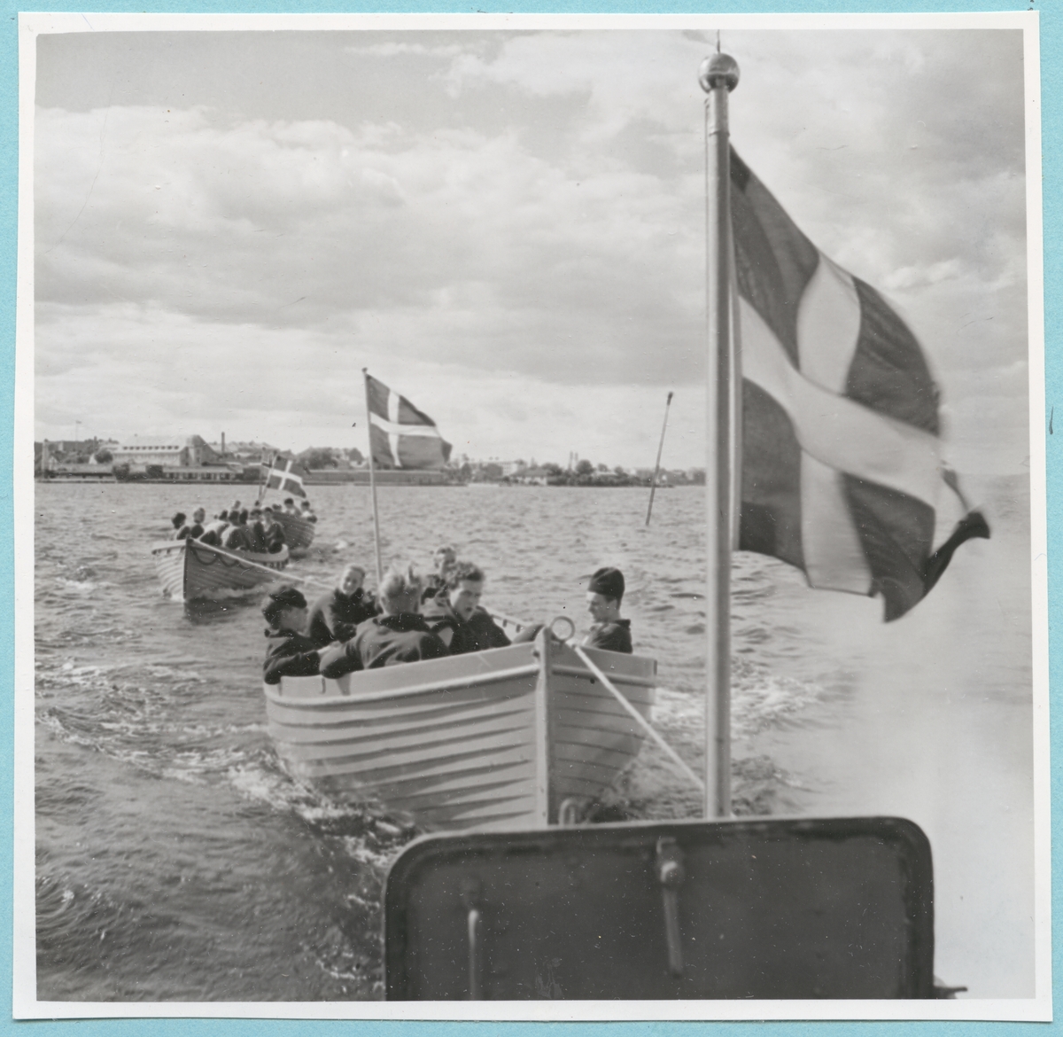 Roddtävling mellan Danska, Norska och Svenska kadettlagen. Från Danska och Norska örlogsbesöken den 29/6 - 4/7 1951. Tre roddbåtar bogseras på rad. Samtliga båtar är utrustade med flaggor. I roddbåtarna sitter kadetter.