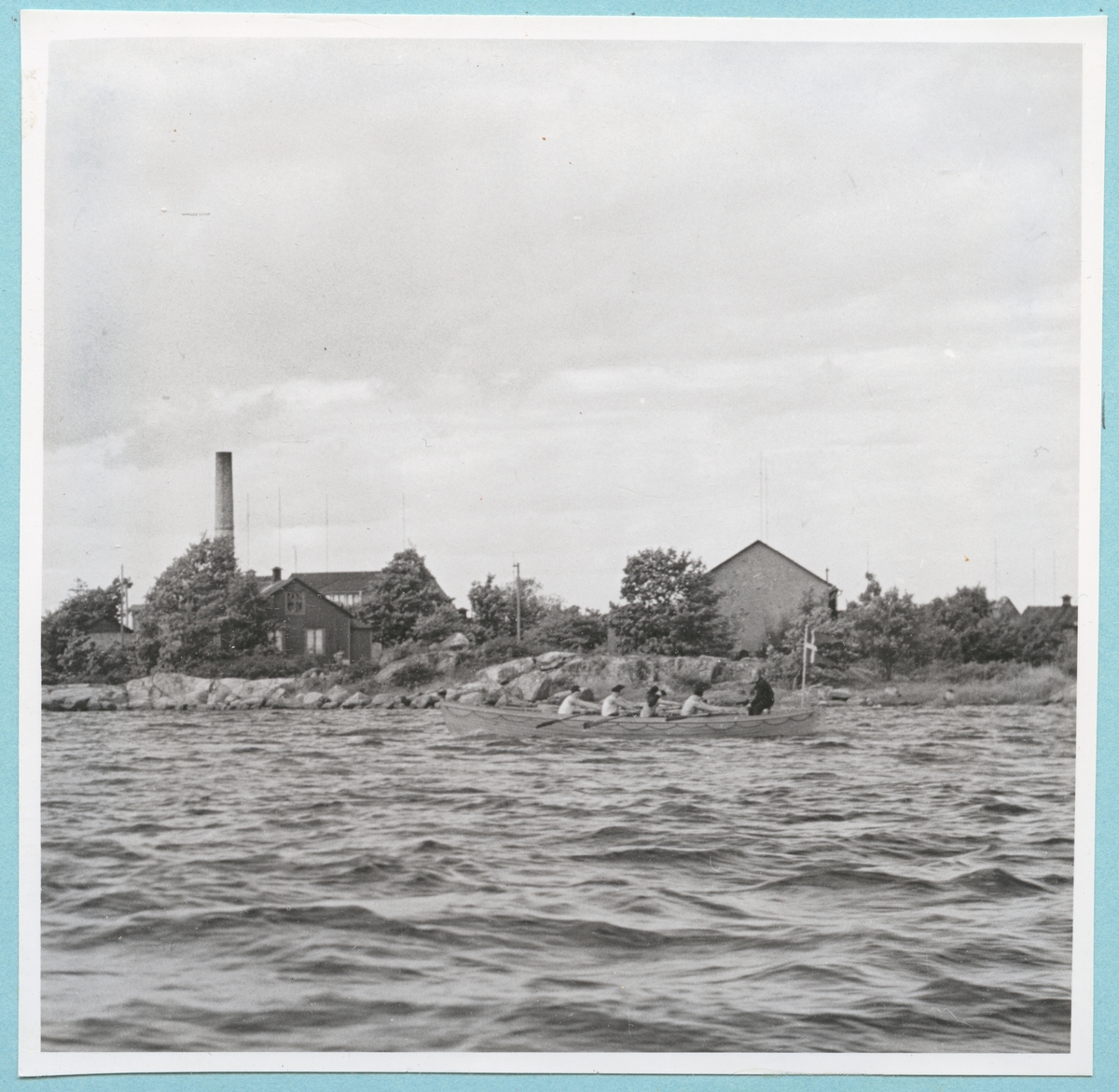 Roddtävling mellan Danska, Norska och Svenska kadettlagen. Från Danska och Norska örlogsbesöken den 29/6 - 4/7 1951. Ett par män sitter i en roddbåt och ror. I bakgrunden syns troligen den södra sidan av Basareholmen.