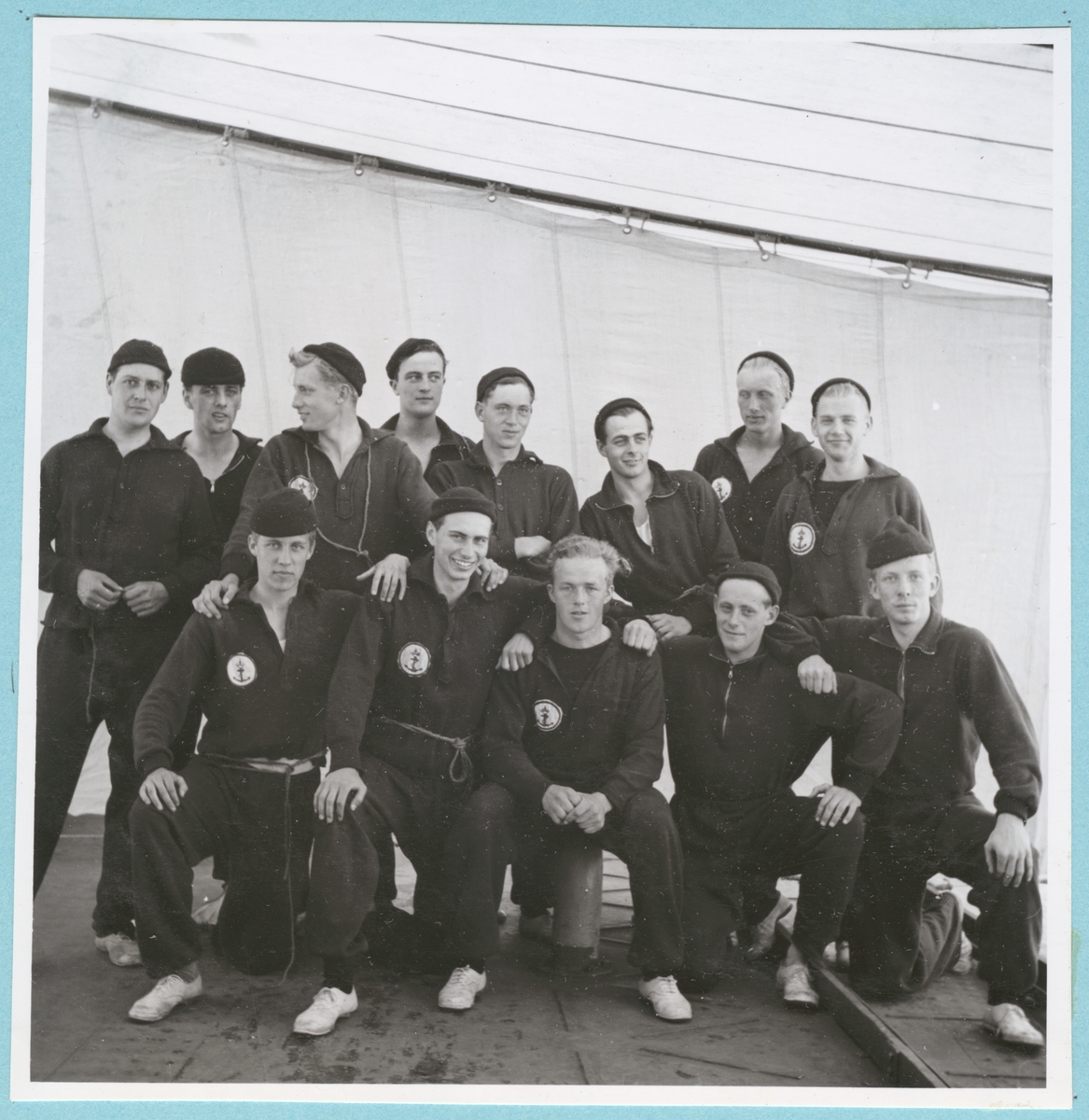 Roddtävling mellan Danska, Norska och Svenska kadettlagen. En grupp tävlanden poserar i två rader framför kameran. Från Danska och Norska örlogsbesöken den 29/6 - 4/7 1951.