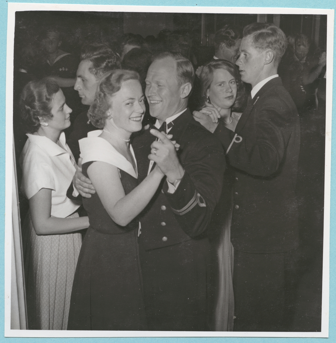 Flera uniformsklädda militärer och finklädda kvinnor dansar tillsammans i par. I mitten syns en löjtnant dansa med en kvinna i mörk klänning. Till höger syns en fränrik dansa med en kvinna som tittar in i kameran.