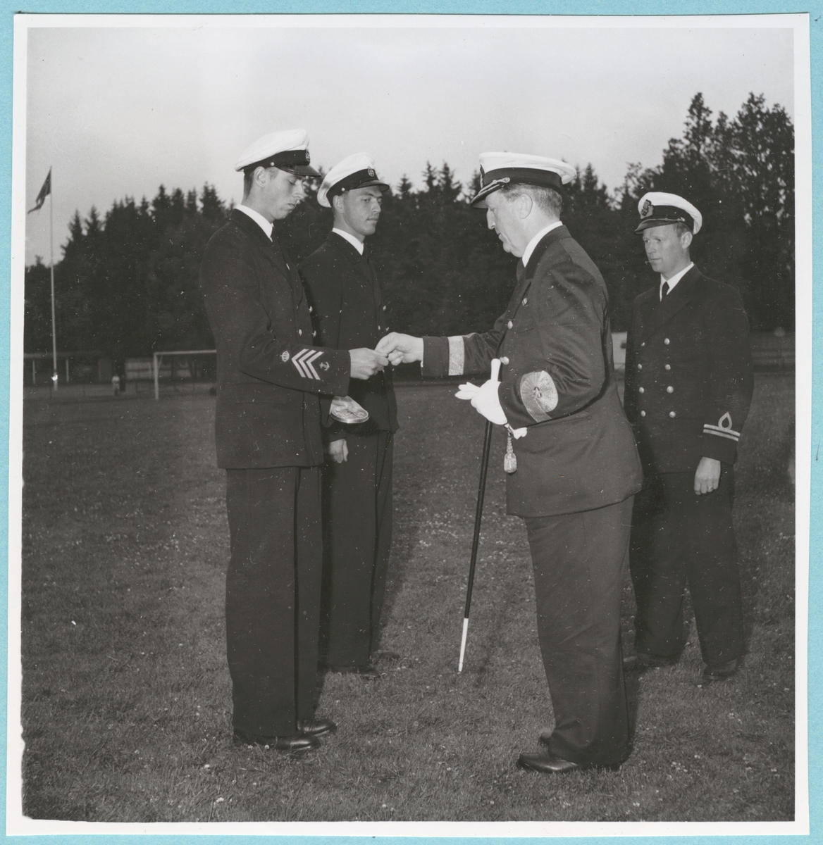 Vinnarna i segling, flaggkadett Törsleff och kadett Scherrer, mottar pris från konteramiral Samuelson under prisutdelningen. Från Danska och Norska örlogsbesöken den 29/6 - 4/7 1951.