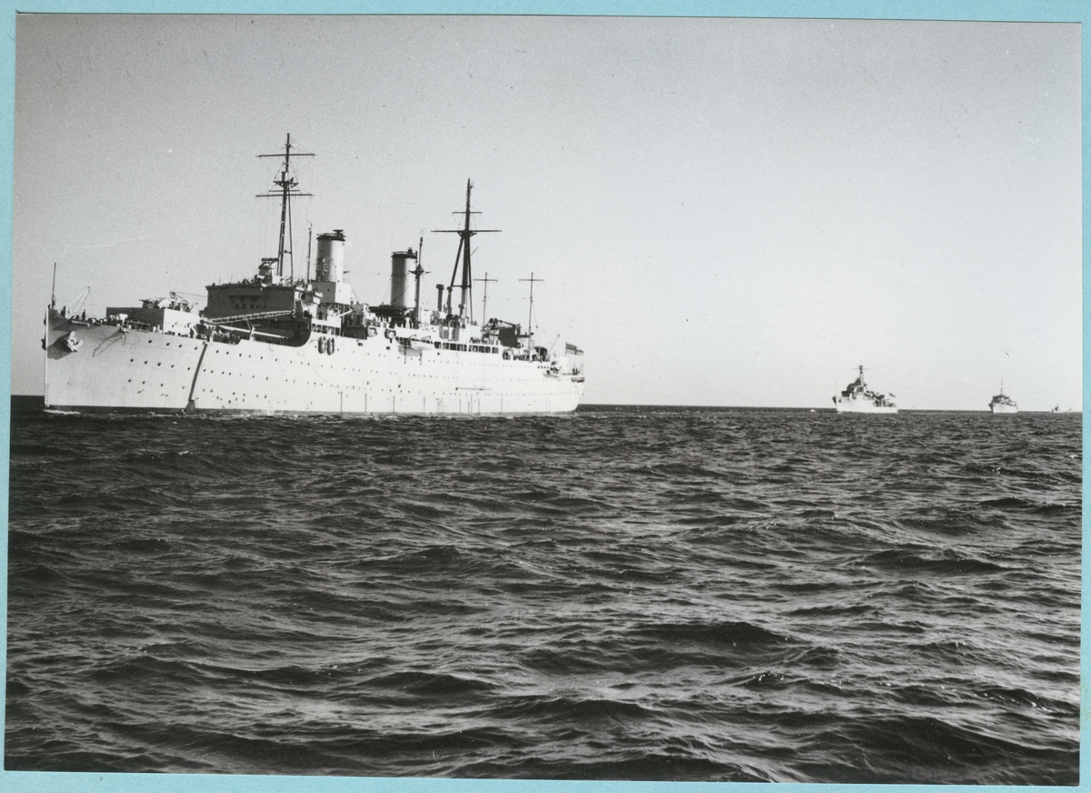 Här inlöper fartygen till Karlskrona redd. Först kommer Ubåtsdepåfartyget H.M.S. Montclare följd av jagaren H.M.S. Zambesi och H.M.S. Woodbridge Haven. Från Engelska besöket i Karlskrona den 9-14 september 1951.
