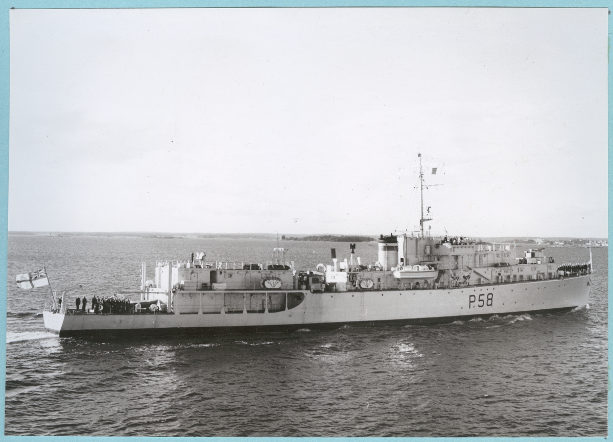 Engelska H.M.S. Woodbridge Havens styrbordssida när den glider in i Karlskrona skärgård. Från Engelska besöket i Karlskrona den 9-14 september 1951.