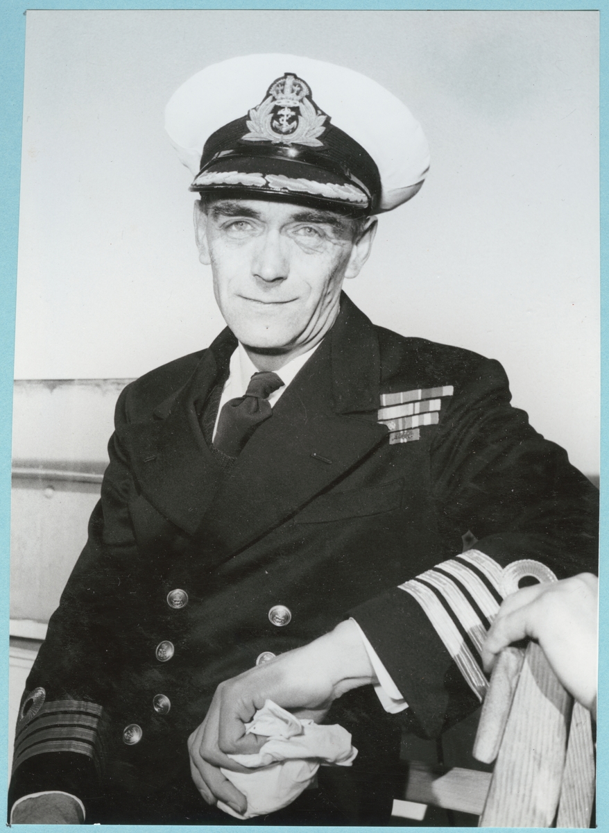 Porträttfoto av chefen på H.M.S. Montclare, Captain Hutchinson. Från Engelska besöket i Karlskrona den 9-14 september 1951.