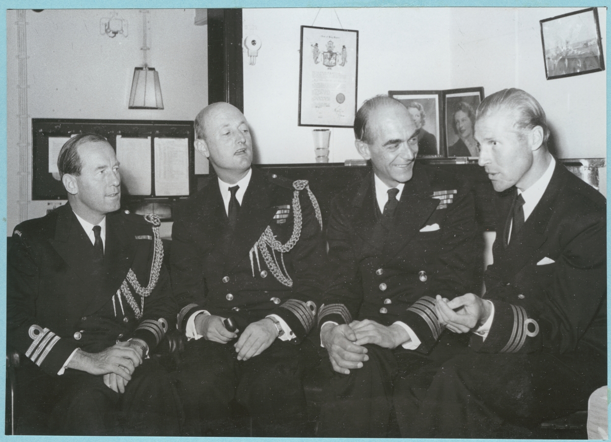 Captain Hutchinson i livligt samspråk med några av sina gäster. Fr. v.: kanadensiske attachén Commander Green, brittiske attachén Captain Wyburd samt svenske pressofficern kapten Wulff. Från Engelska besöket i Karlskrona den 9-14 september 1951.