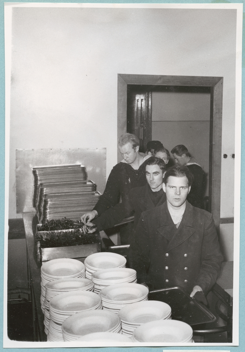 Uniformsklädda unga militärer står i en matkö och plockar till sig brickor, bestick och skålar. De två främre männen tittar in i kameran.