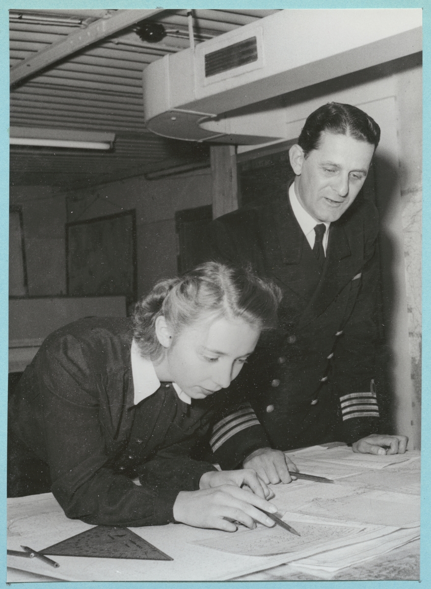 Bilder från krigsledningscentralen. Kommendörkapten Magnus Starck, klädd i uniform, står vid ett bord med flera dokument på. Bredvid står en ung kvinna lutad över bordet med en penna i handen.
