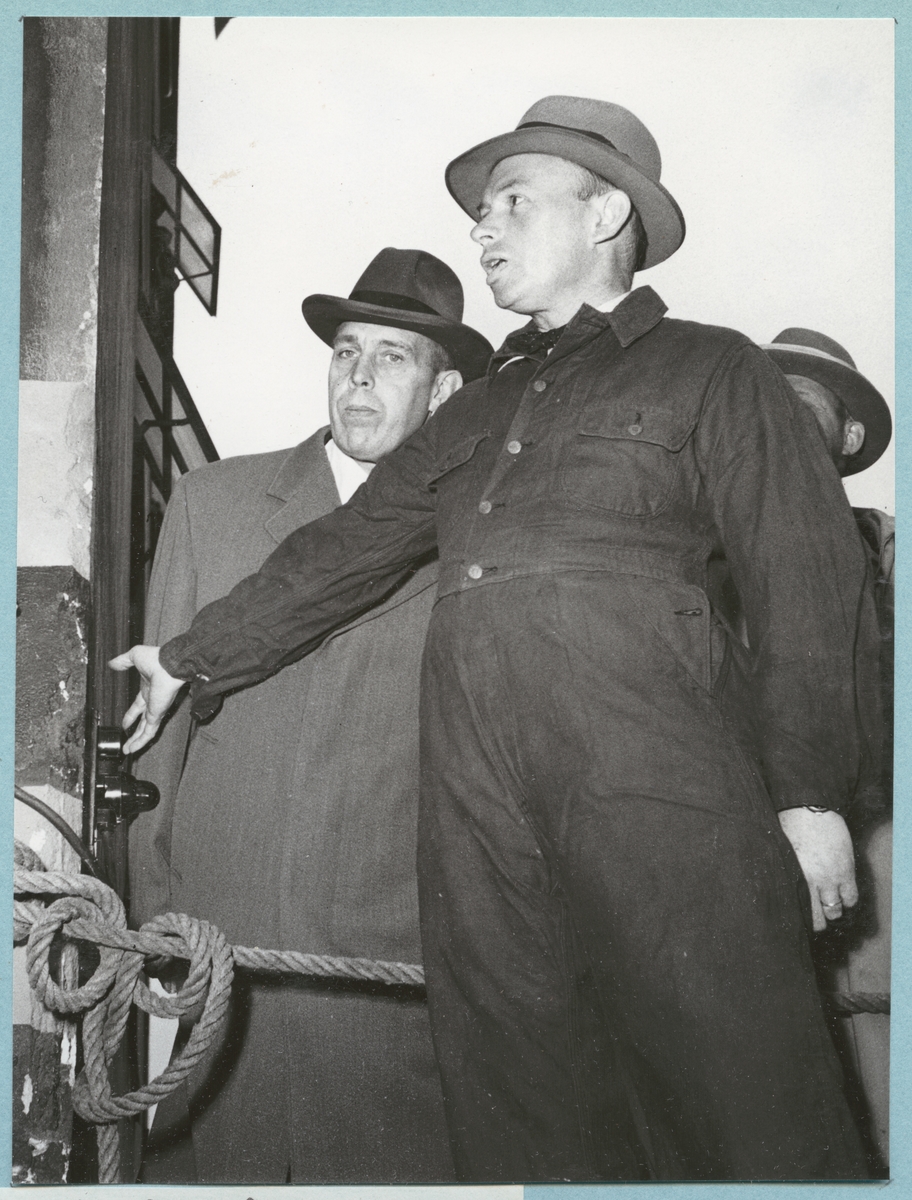 Ing. Erlandsson, klädd i arbetskläder, trycker på startknappen. Bilder från isbrytaren Thules sjösättning den 11/10 1951. Bakom honom står ytterligare två män i hatt och rock. En av männen tittar in i kameran.