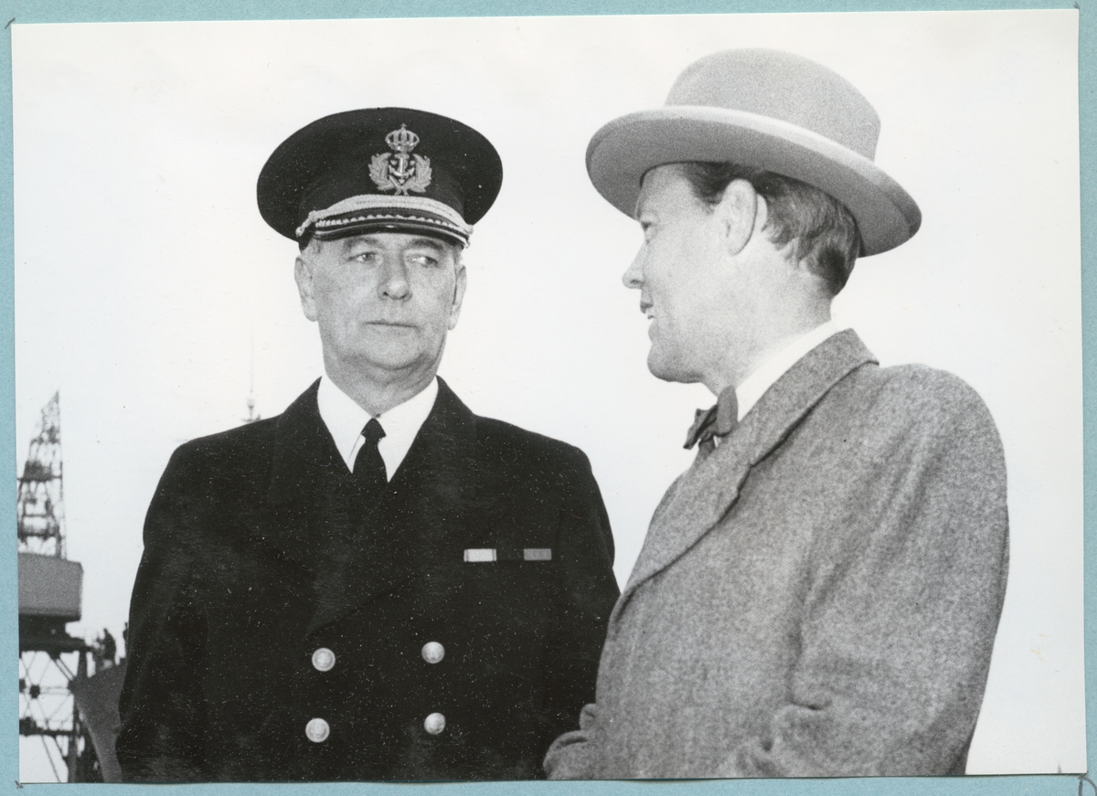 Titel: En uniformsklädd militär står tillsammans med en civilklädd man i rock och hatt.