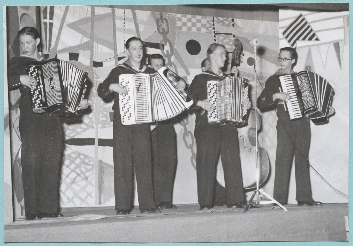 Sex uniformsklädda flottister står på en scen och spelar på musikinstrument, bl. a. dragspel och ståbas. Framför dem står en mikrofon på ett stativ.