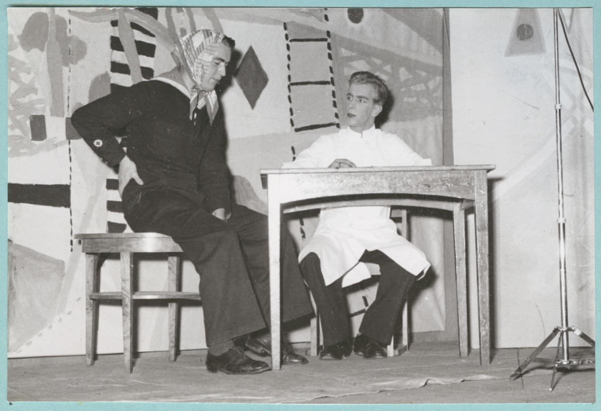 Två utklädda flottister uppträder i en revy på en scen, sittandes framför ett bord. Bakom dem syns en målad bakgrund med färger och former inspirerade av marinen.