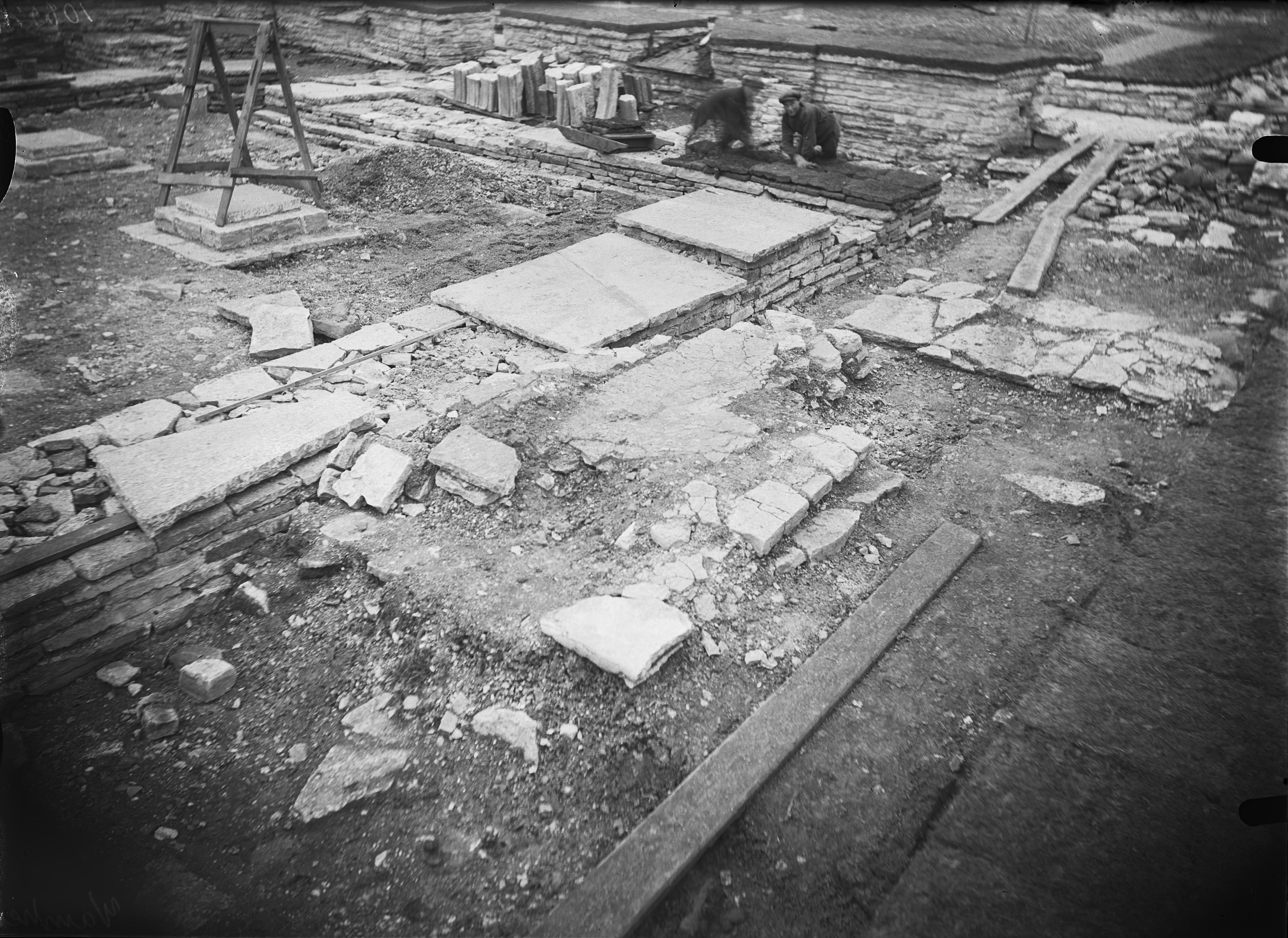 Rester av eldhärd och äldre mur i området mellan refektoriet och östra längan. Från sydöst.