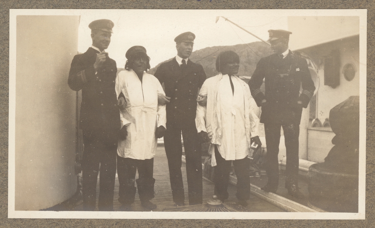 Tre sjöofficerare möter två män som till synes tillhör Sydamerikas ursprungsbefolkning. Båda männen är klädd i alldeles förstora vita skjortor och mörk byxor som uppenbarligen är lånad från besättningen.