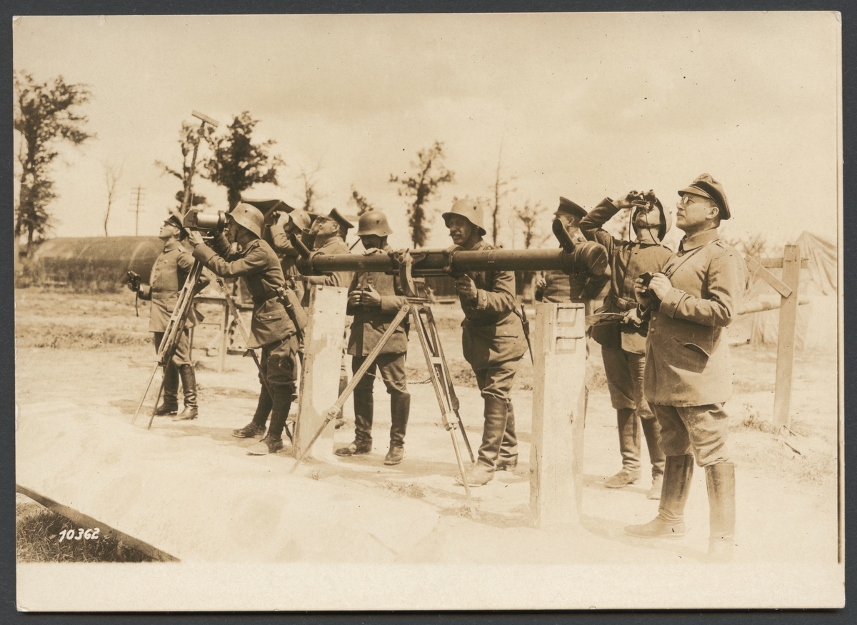 Titel: Bilden visar en grupp soldater som arbetar med en mätinstrument för att iakta flygplan.