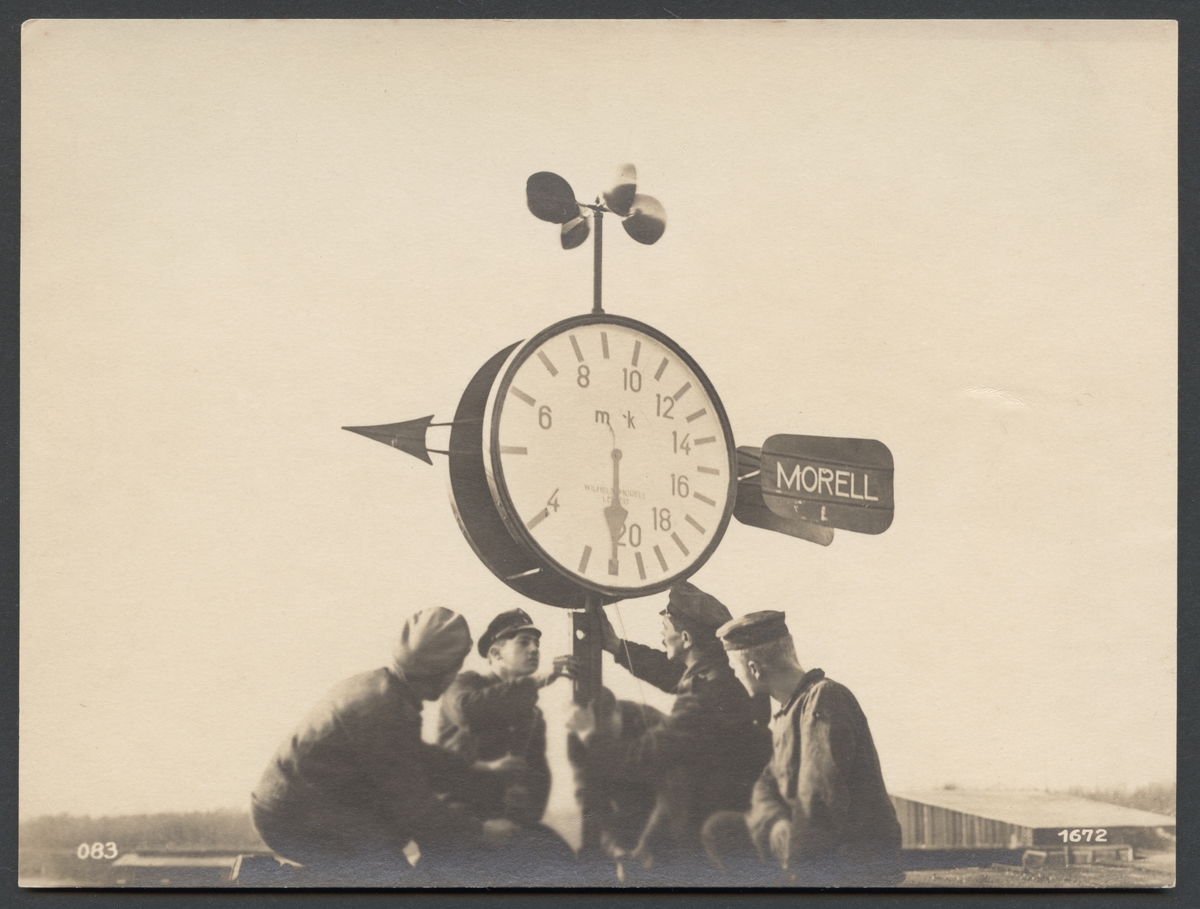 Bilden visar en grupp soldater som arbetar på en stor vindmätare, som kan ange vindens styrka och rikning.