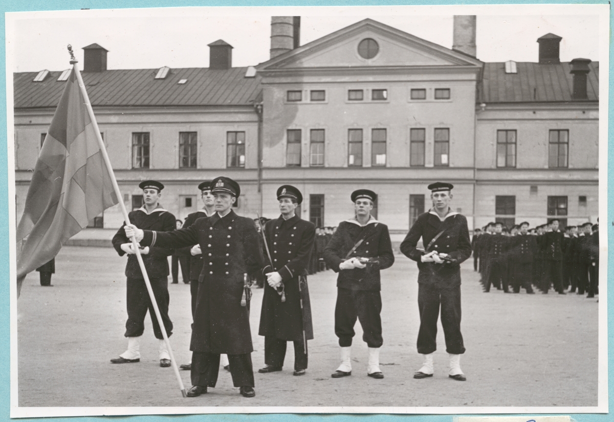 Fem uniformsklädda och beväpnade militärer står på kaserngården framför matinrättningen tillhörande bataljon Sparre. Framför de fem militärerna står ytterligare en militär som håller i en flagga. På kaserngården syns även flera uppställda militärer.