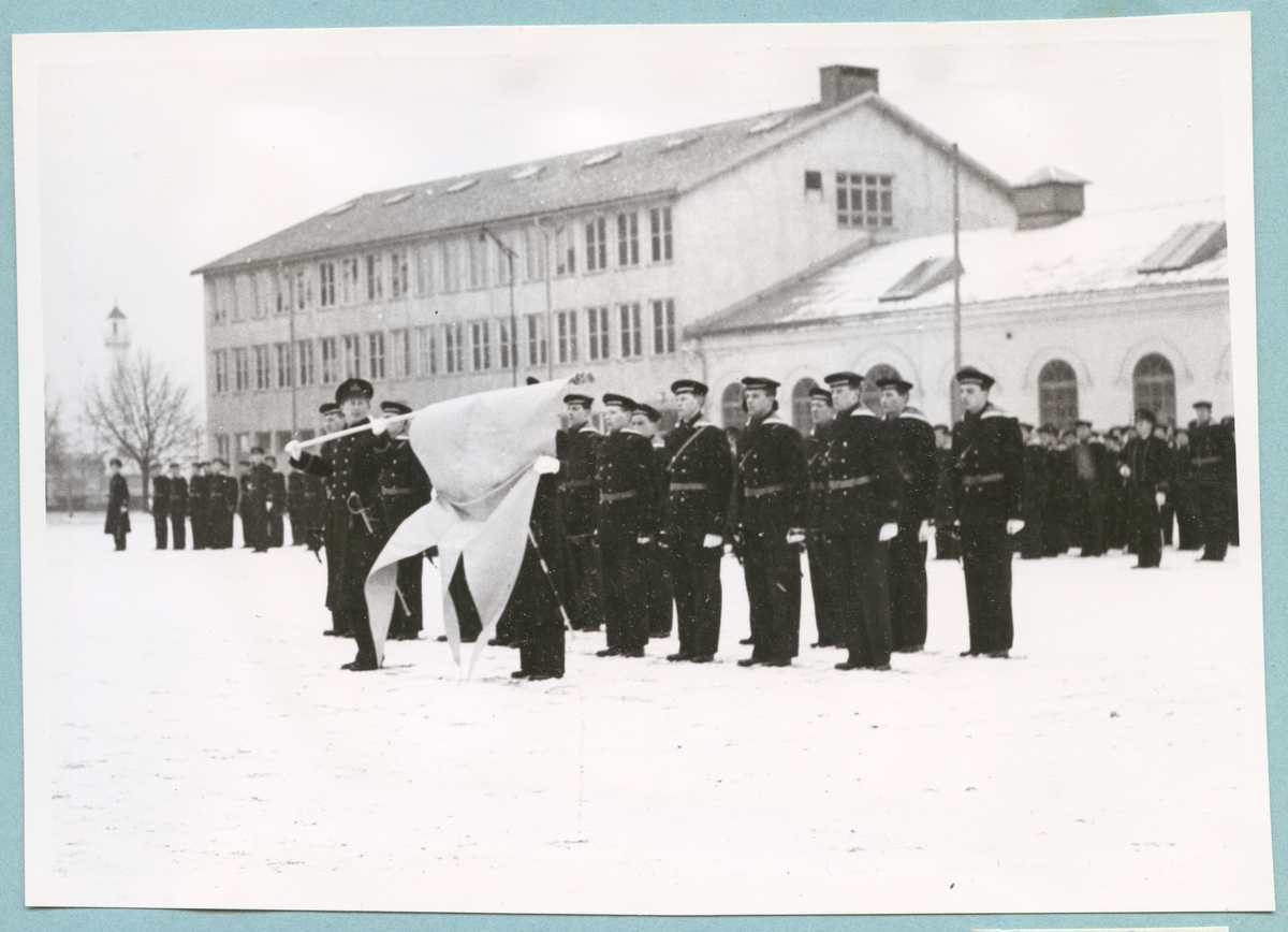 Uniformsklädda flottister står uppställda i snön på bataljon Sparres kaserngård. Längst fram står en militär och en fänrik och håller i en stor flagga. I bakgrunden syns några av bataljonens byggnader.