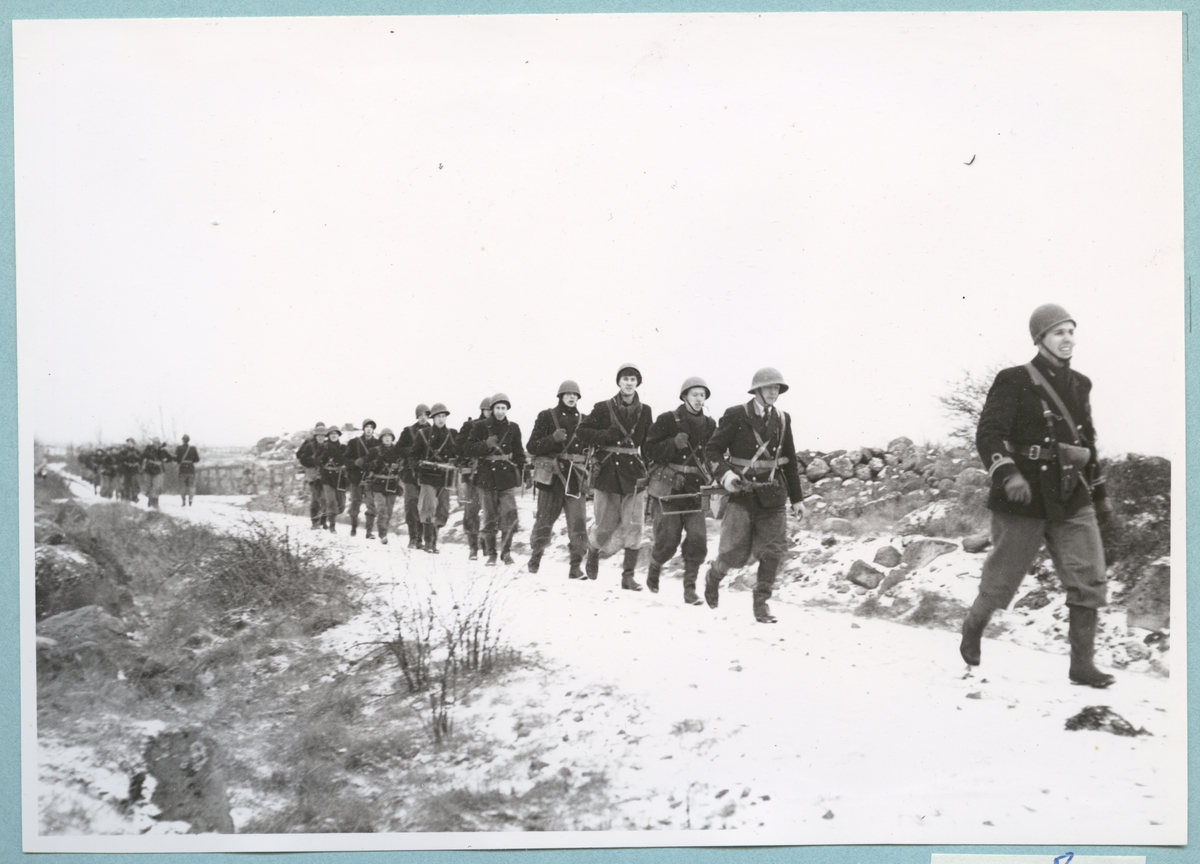 Uniformsklädda militärer marscherar på en snötäckt grusväg ledda av en löjtnant. Samtliga har hjälm på huvudet. Grusvägen kantas på ena sidan av en stenmur.