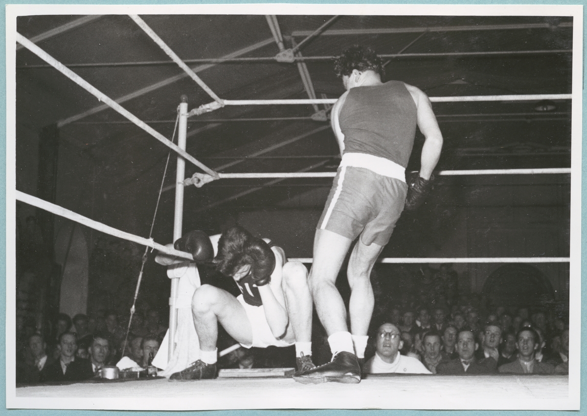 Två idrottsklädda män utkämpar en boxningsmatch i en boxningsring. På händerna har de boxningshandskar. En av männen står upp medan den andra sitter på huk på golvet, med ena armen stödd mot ringen. Nedanför boxningsringen syns en sittande publik.